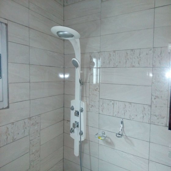 - Salle de bain propre avec colonne de douche spéciale